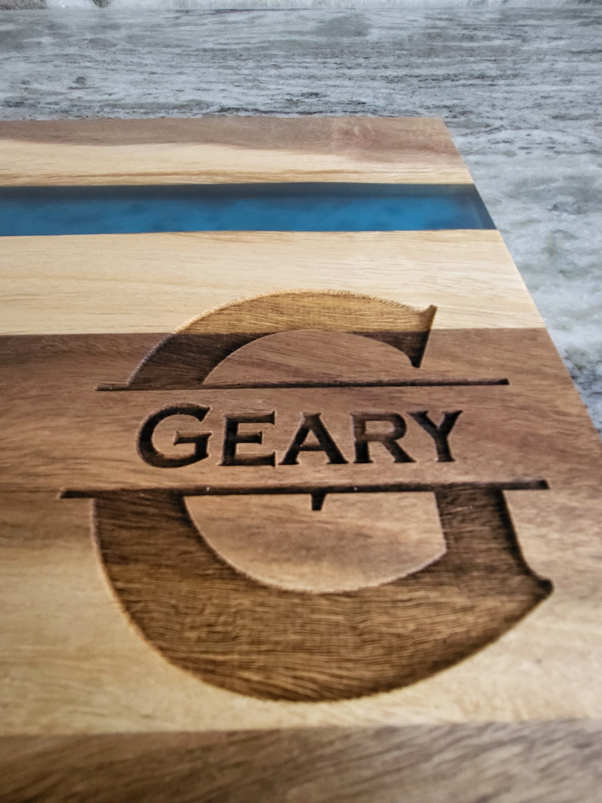 Beautiful blue resin cutting board, complete with custom name of your choice!